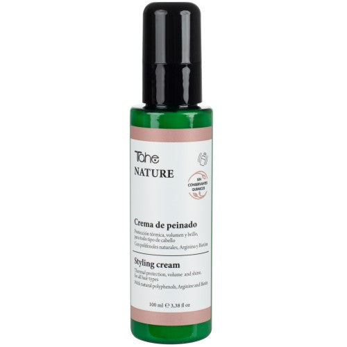 Crema de peinado Tahe Nature de 100ml que proporciona protección térmica mientras aporta volumen y brillo excepcional al cabello. Su fórmula enriquecida con polifenoles naturales y libre de conservantes químicos respeta la fibra capilar. Producto vegano y 100% reciclable, ideal para estilizar el cabello de forma responsable con el medio ambiente.