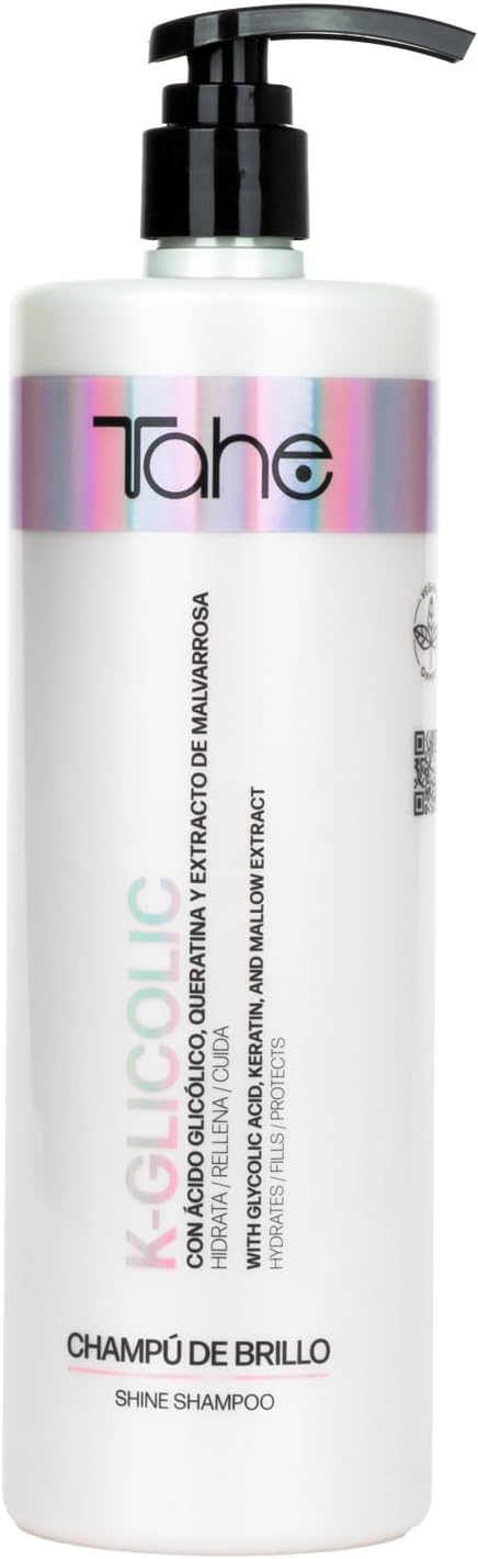 Champú de brillo TAHE K-GLICOLIC enriquecido con queratina y extracto de malvarrosa que hidrata profundamente el cabello mientras mejora la estructura de la fibra capilar. Su fórmula profesional aporta luminosidad excepcional y restaura el cabello dañado, dejándolo suave, manejable y con un brillo intenso. Formato profesional de 1000ml para uso prolongado en salones.